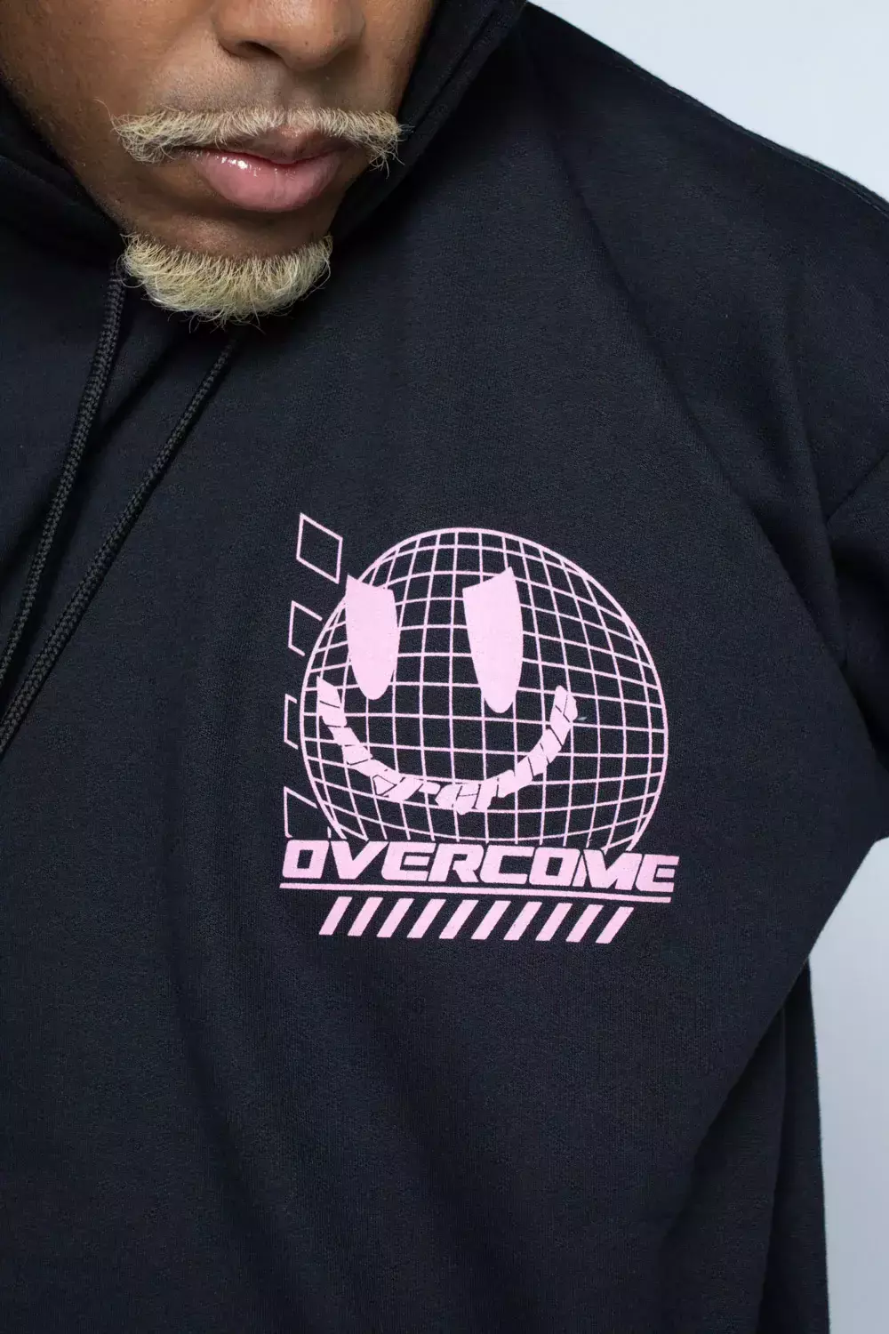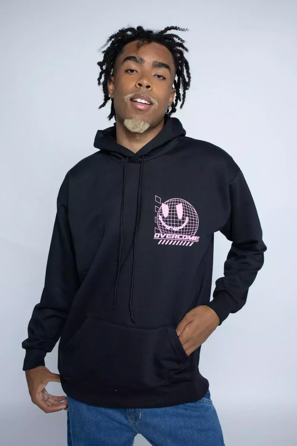 Moletom Overcome Canguru Globo Preto com estampa frontal em alto contraste e visual marcante. Conta com capuz ajustável, bolso canguru e modelagem confortável, perfeito para o dia a dia no estilo urbano.